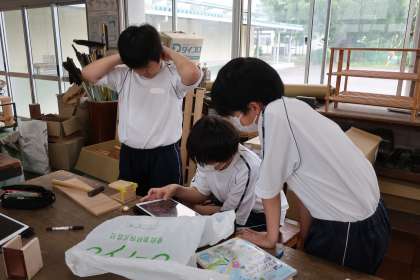 木製品「融合ボックス」制作の学習で、「丈夫に組み立てるには?」をテーマに、作品づくりに真剣に取り組んでいました。
