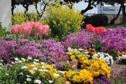 例年、春の花壇で彩を添えるチューリップ。実はその球根、公益財団法人日本教育公務員弘済会愛知支部に申し込みをしていただいているものです。