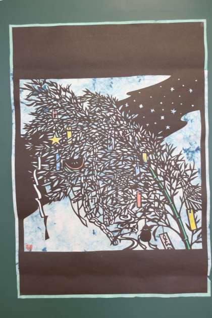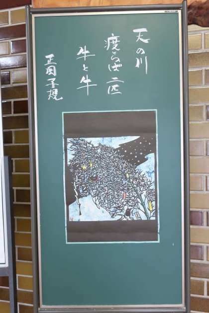 今回のテーマは「七夕」。願い事の書かれた短冊が飾られた笹と天の川が表現されています。また、正岡子規の句も記されています。