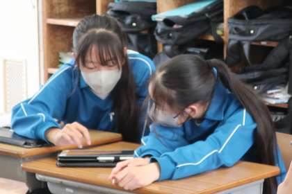 説明文「クマゼミ増加の原因を探る」の学習で、「全体と部分の関係に注意して、構成を捉えよう」をテーマに、仲間の考えをタブレットで確認していました。