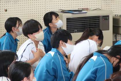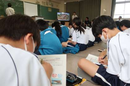6/24 1-23 本物から学ぶ 4 公開日 2025/06/24 更新日 2025/06/24 各学年から 1年2・3組の社会・歴史分野の授業の様子です。 今回は豊田市博物館から学芸員さんをお招きし、「自分たちの説と博物館からの情報を関連付けて考えよう」をテーマに、古代の豊田の様子と他地域とのつながりを考えていました。