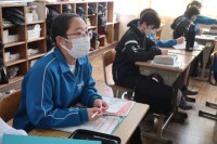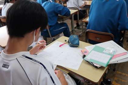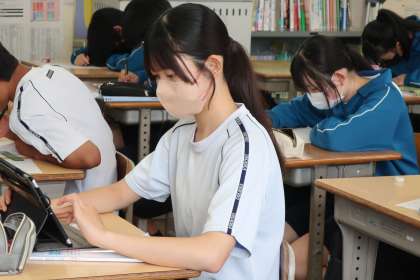 単元のまとめとをプリントやテキスト、学習用タブレットを使って取り組んでいました。