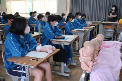 男女の体の変化、月経・妊娠の仕組み、胎児の成長、性感染症の種類やその予防などを学んだあと、赤ちゃん(模型)の抱っこ体験を通して、10代の妊娠を出産の社会問題から親になることの責任や意味を考える機会となりました。