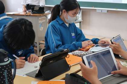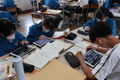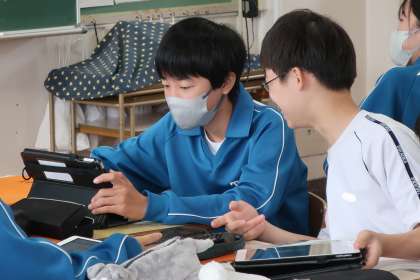 説明文「クマゼミ増加の原因」の単元で、「文章の構成や展開について考えたことをまとめ、話し合おう」をテーマに、仲間の考えを集約されたタブレット画面を確認しながら、学習を進めていました。