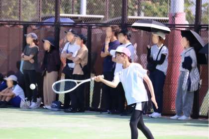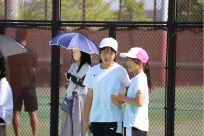 写真は、柳川瀬公園で行われたソフトテニス部の大会、団体戦の様子です。