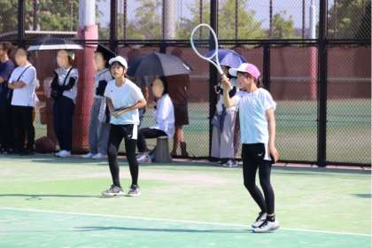 写真は、柳川瀬公園で行われたソフトテニス部の大会、団体戦の様子です。