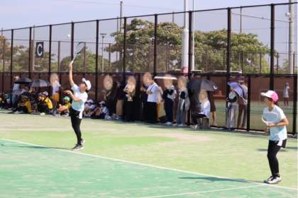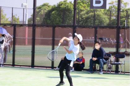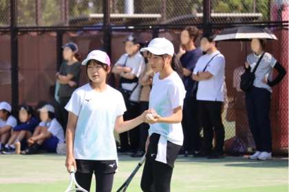 写真は、柳川瀬公園で行われたソフトテニス部の大会、団体戦の様子です。