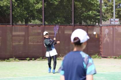 写真は、柳川瀬公園で行われたソフトテニス部の大会、団体戦の様子です。