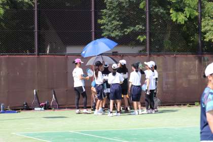 写真は、柳川瀬公園で行われたソフトテニス部の大会、団体戦の様子です。