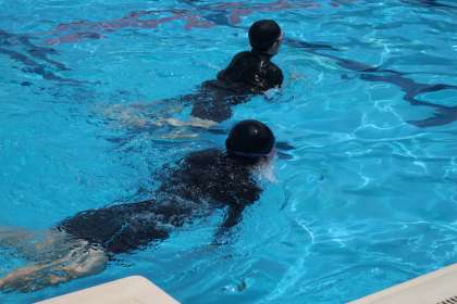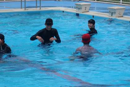 平泳ぎをマスターしようと仲間に教えてもらい、一生懸命練習していました。