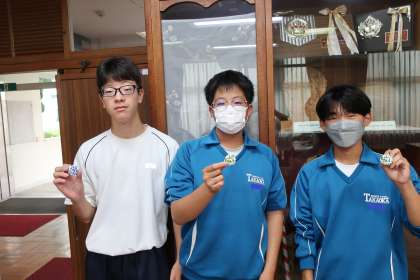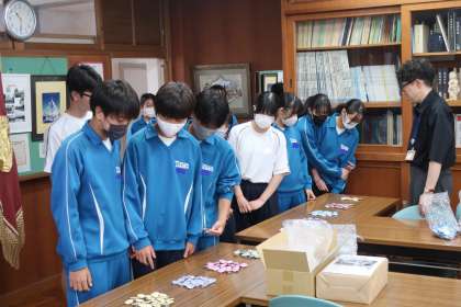 本日は、先日行われた「マイタウンおいでん高岡」に参加した生徒(3年生対象)に学校オリジナル缶バッジ(=「WE LOVE たかおか」バッジ)が配付されました。イベントの当日も缶バッジを手にした今日も笑顔いっぱいの3年生です。