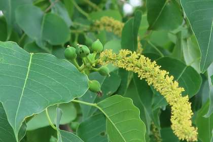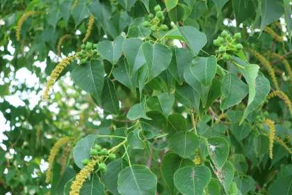 東門付近に植わるナンキンハゼの木。一週間前に花の様子をお伝えしましたが、現在はその花も落ち始め、実が付き始めています。陸橋から東門に続く道路沿いにあるため、毎朝、落ちた花の清掃を生徒たちがボランティア(=TLC活動)で行ってくれています。