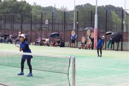 写真は、柳川瀬公園テニス場で行われたソフトテニス部の大会・個人戦の様子です。