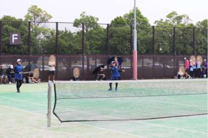 写真は、柳川瀬公園テニス場で行われたソフトテニス部の大会・個人戦の様子です。