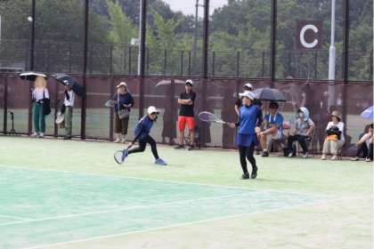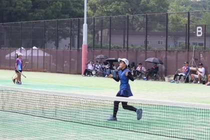 写真は、柳川瀬公園テニス場で行われたソフトテニス部の大会・個人戦の様子です。