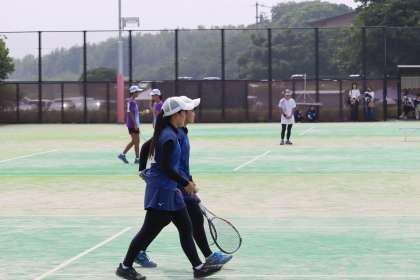 写真は、柳川瀬公園テニス場で行われたソフトテニス部の大会・個人戦の様子です。