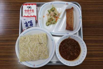 ジャージャーめん(中華めん)、中華サラダ、春巻き、乾燥小魚、牛乳 でした。