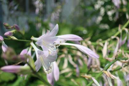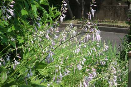 配膳室北側の花壇の一角に咲くムラサキギボウシ(紫擬宝珠)です。淡い紫色の花が涼しさを感じさせてくれます。また、存在感のある放射状に広がる大きな葉も特徴です。花言葉は「落ち着き」「沈静」「冷静」。暑さに気持ちを奪われることなく、冷静に生活したものですね。