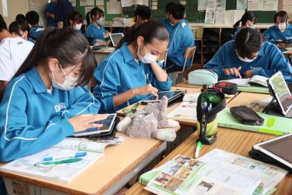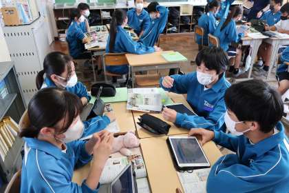 「日本国憲法の三つの基本原理をまとめよう」をテーマに、グループ内で分担をし、立法権・行政権・司法権について調べたことをまとめていました。