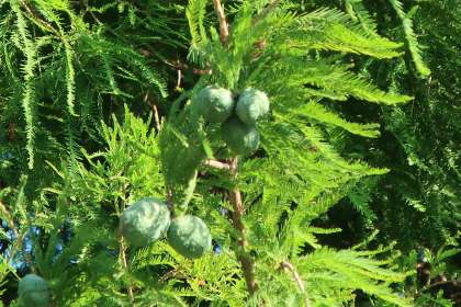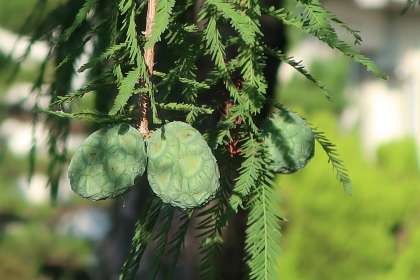 正門の両脇にそびえる「ラクウショウ(落羽松)」。写真はその実になります。