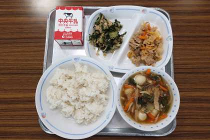 7/14 今日の給食 公開日 2025/07/14 更新日 2025/07/14 特別活動 今日の献立は ————— 五目スープ、海藻サラダ、キムチチャーハン(麦ごはん)、牛乳 でした。 *エネルギー:782kcal たんぱく質:29.1g