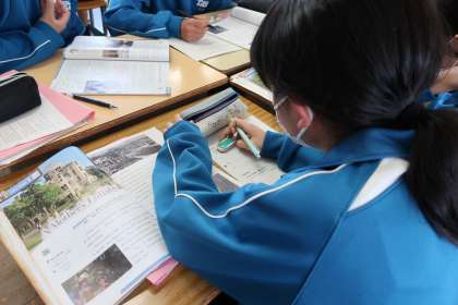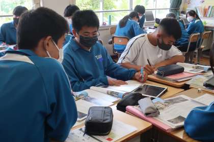 長文の要約をまとめるため、重要な分を洗い出していきます。仲間と考えを出し合いながら進めていました。