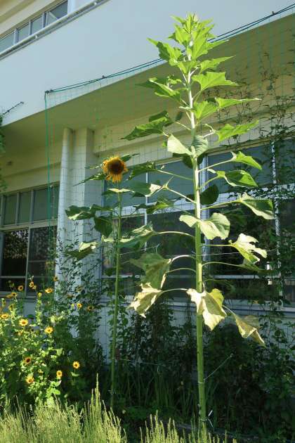 2棟南側に植わる巨大なヒマワリ。高さは3メートルほど(教室の天井の高さを超えています)になりますが、このヒマワリだけがまだ花を咲かせていません。この時点で、花ではなく丈を伸ばすことに栄養を使い続けているようです。花が咲くタイミングも気になるところですが、どこまで伸びるかはもっと気になるところです。この夏休みの楽しみの一つでもあります。
