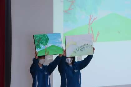 写真は、美術部の発表の様子です。