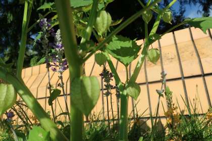 正門横の花壇に自生するホオズキを見つけました(写真下)。ホオズキは漢字で「鬼灯」や「鬼燈」と書くそうで、赤くぼんやりと光るように膨らむ少し怪しげな姿を「鬼の提灯」と言っていたことに由来しているようです。