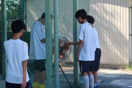 部室前にはミスト付き扇風機が用意され、休憩時のクールダウンで次の練習メニューに備えています。