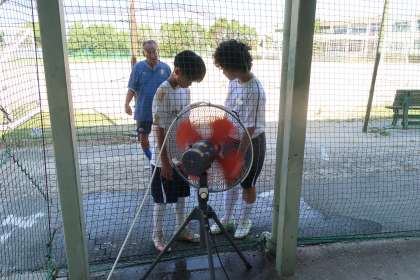 部室前にはミスト付き扇風機が用意され、休憩時のクールダウンで次の練習メニューに備えています。