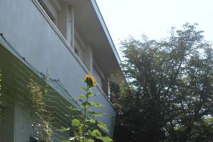 校内で一番高いヒマワリにようやく花が咲きました。「向日葵(ヒマワリ)」の字の通り、花がしっかりと太陽に向いています。ここまで大きく立派に成長したヒマワリを育てられたのは初めてなので、本当にうれしく思います。種をしっかりと残し、次代につなげていきたいと思います。