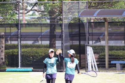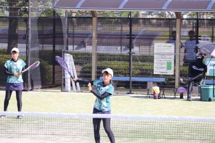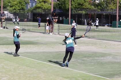 写真は、安城市総合運動公園テニスコートで行われたソフトテニス部の大会・個人戦の様子です。