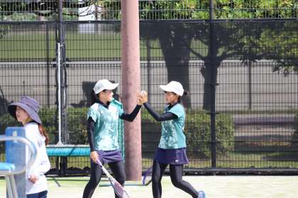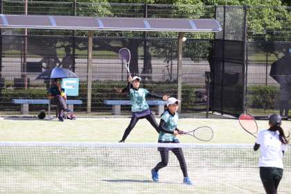 写真は、安城市総合運動公園テニスコートで行われたソフトテニス部の大会・個人戦の様子です。