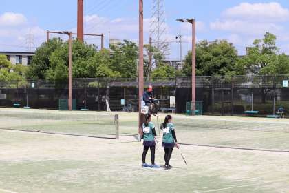 写真は、安城市総合運動公園テニスコートで行われたソフトテニス部の大会・個人戦の様子です。