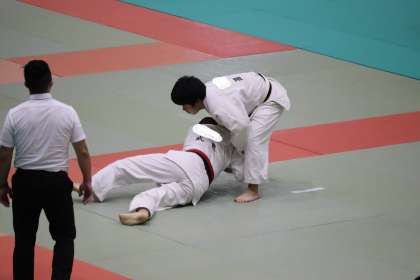 写真は、メディアス体育館ちた(知多市民体育館)で行われた柔道部の大会の様子です。