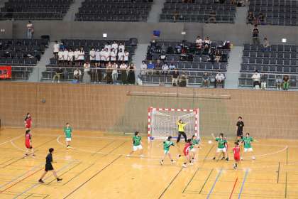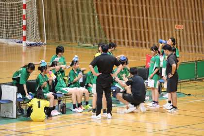 写真は、スカイホール豊田で行われた女子ハンドボール部の大会の様子です。