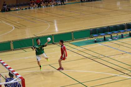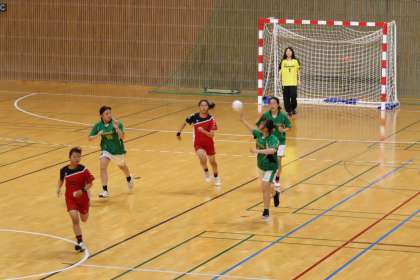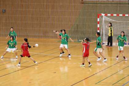 写真は、スカイホール豊田で行われた女子ハンドボール部の大会の様子です。