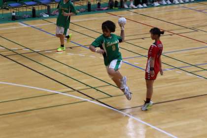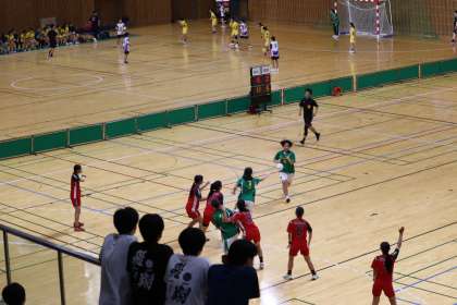 写真は、スカイホール豊田で行われた女子ハンドボール部の大会の様子です。