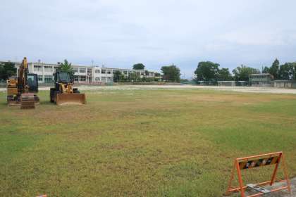 例年の夏休み、特に部活動が行われなく時期に合わせて勢いを増してくるのが、運動場の雑草。今年は改修工事が入るため、草刈りを見合わせていました。でも、これまでのような勢いがないばかりか、茶色く枯れ始めている場所もあります。異常な暑さとそれまで雨が降らなかったことが原因だと思いますが、改修工事のために準備された重機の存在に気持ちが萎えてしまったようにも見えます。