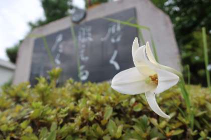 写真上は、昭和59年度の校舎増改築の際に当時の父母教師会の役員・理事のみなさんによって立てられた記念碑の前に咲くユリの花です。記念碑だけでなく、このユリにも当時のみなさんの志が宿っているように見えます。