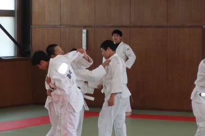 豊田工科高校の柔道部と合同練習です。本校顧問が立ち技、工科高校顧問さんが寝技の練習メニューを熱心に指導してくださいました。