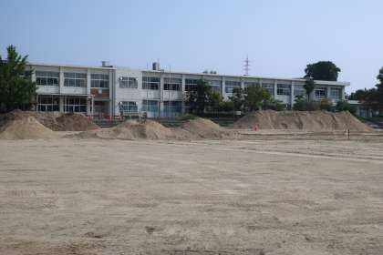 雑草やうねり、水はけの悪さで悩まされていた運動場の表面が削られ、現在はこの状態です。とても人の手だけではできない作業も、複数台の重機がフル稼働し、何とかここまでたどり着いています。ただ、雨の日がほとんどないことで土の硬さが増しているようで、作業はとても大変そうです。