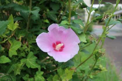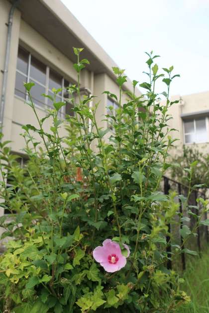 2棟東端にある配膳室の北側にムクゲの花がとてもきれいに咲いています。夏の暑さも吹き飛ぶ鮮やかさです。