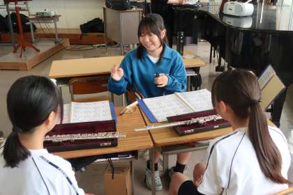 楽器ごとに先輩が後輩の指導に当たっています。1年生も個人の楽器を手にし、練習へのモチベーションがさらに上がっていたようです。