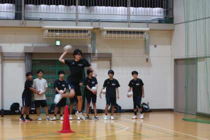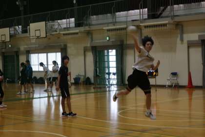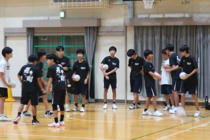 本校OBで高校生の熱心な指導のもと、オフェンス強化の練習メニューに取り組んでいました。1年生は錬成館で、正確なパスとキャッチを習得するためのメニューで汗を流していました。