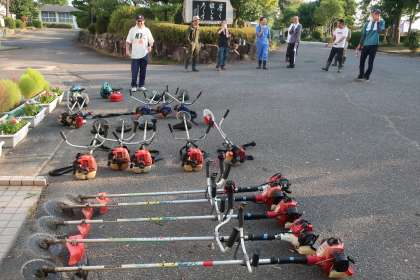 20名ほどの「草刈りボランティア隊」の皆さんが、続々と来校されました。メンバーは、父母教師会のOB会や地域の有志の方々です。
