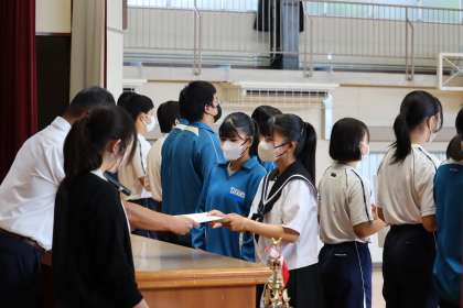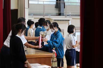 集会の前半は、この夏の部活動などの大会で、優秀な成績を残した生徒たちの表彰伝達が行われました。