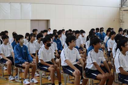 表彰伝達、後期生徒会役員の認証のあと、校長先生と生徒指導主事から話がありました。真剣に話を聴いている様子が印象的でした。