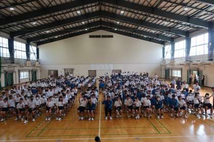 全校集会での校長先生の話の最中、生徒たちの元気な様子を撮影しました。
